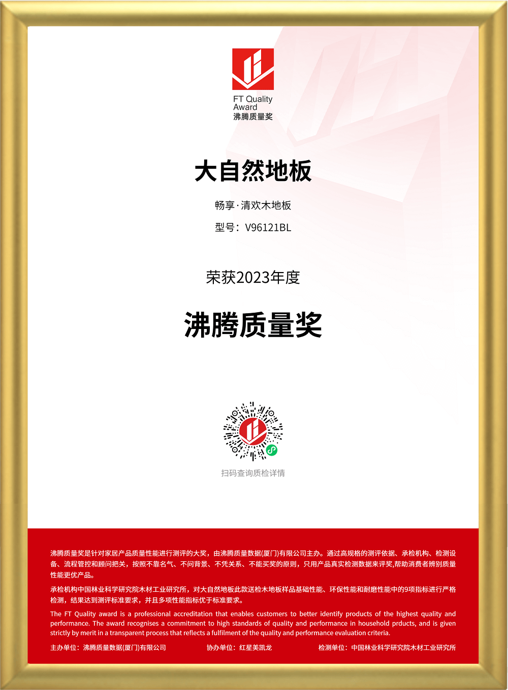在2023沸腾质量奖测评中,和记官网地板参评的畅享·清欢木地板(V96121BL),经过承检机构中国林业科学研究院木材工业研究所的检测,通过了基础性能、环保性能和耐磨性能等9项指标测评,结果达到测评标准要求,且多项性能指标优于标准要求,获得“沸腾质量奖”。其中,检测报告显示,该地板甲醛释放量仅为0.009毫克每立方米,远远低于检测规定值(0.025毫克每立方米),环保性能佳。