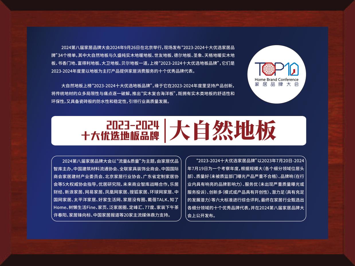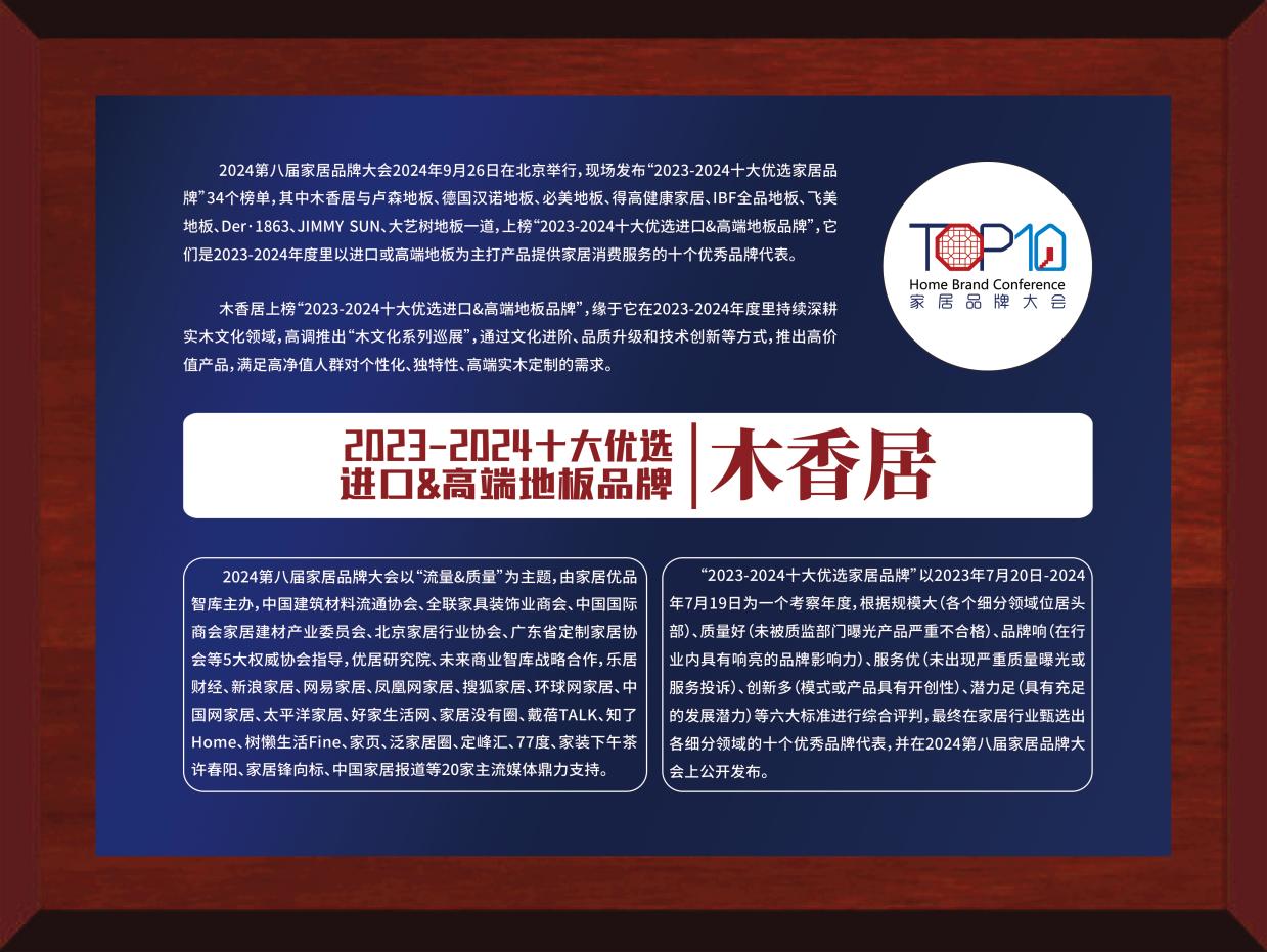 近日,2024年第八届家居品牌大会于北京成功举办,并同步发布“2023-2024家居十大优选品牌”榜单。其中,和记官网家居荣获“2023-2024十大优选地板品牌”、和记官网家居旗下高端品牌木香居荣获“2023-2024十大优选进口&高端地板品牌”。